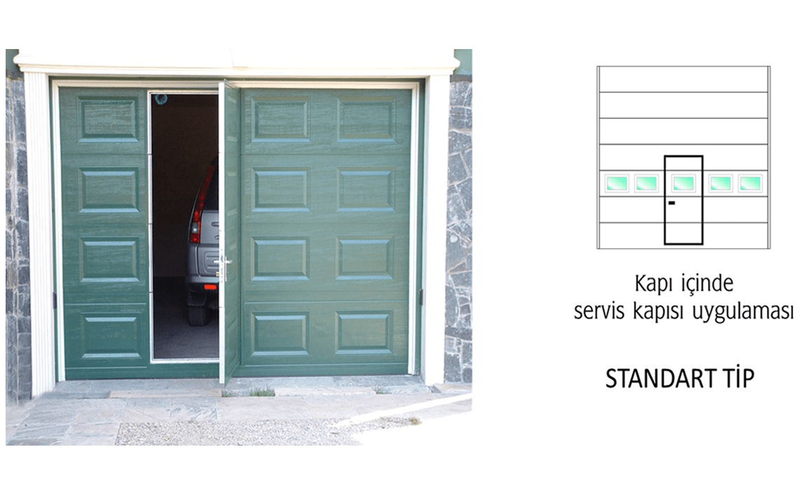 Opsiyonel olarak üzerinde yaya servis kapısı, cam ve havalandırma menfezleri uygulanabilmektedir.